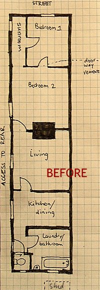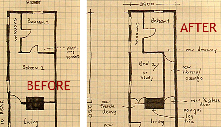 So I spent hours working on alternative floor plans for the whole house, before eventually deciding to shave off some of the second bedroom to create a passage from the living room direct to the front bedroom. While obviously reducing the size of the second room, this was the largest room in the house, so it could best handle the reduction in size.