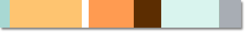 ↑ This blue-green-orange palette would make an upbeat, "year-round summer" room color scheme. It looks good on textiles for a summer house, veranda, deck, or garden furniture. The combination here is of orange and tangerine hues with a range of analogous blues and greens from the opposite side of the 3-primary color wheel.