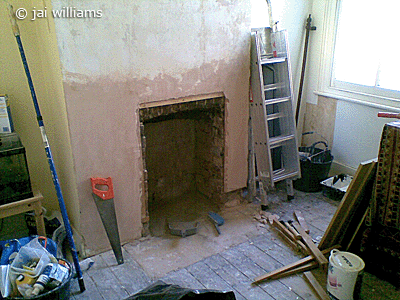 I removed all the old wallpaper and the bit of hard board across the open fireplace. Once the walls were made good, I tried my hand at